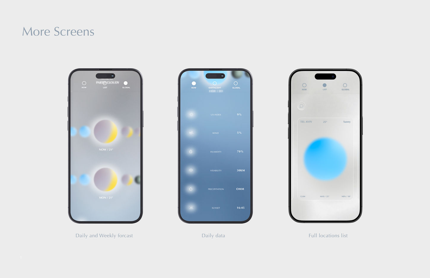 The app translates weather data into a visual meditative experience. The main image changes color and movement according to the weather conditions - like the changing light on Tadao Ando's concrete surface.